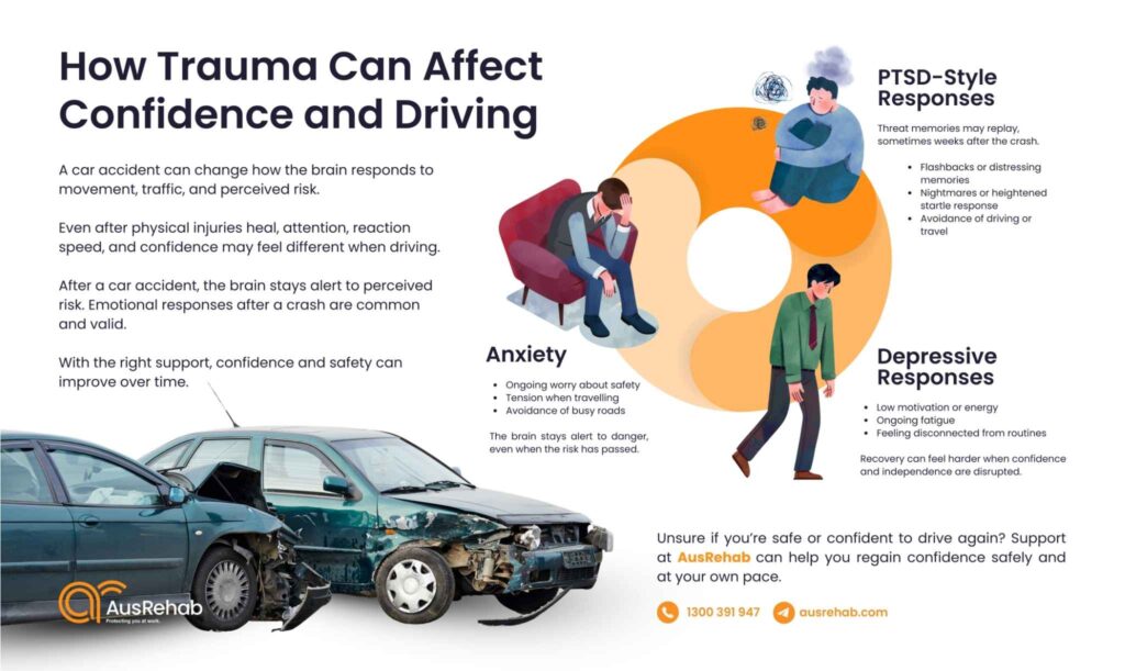 💡 These are normal trauma responses, not a personal weakness. Many people experience them after a crash. With support and gradual exposure, driving confidence and safety can improve.