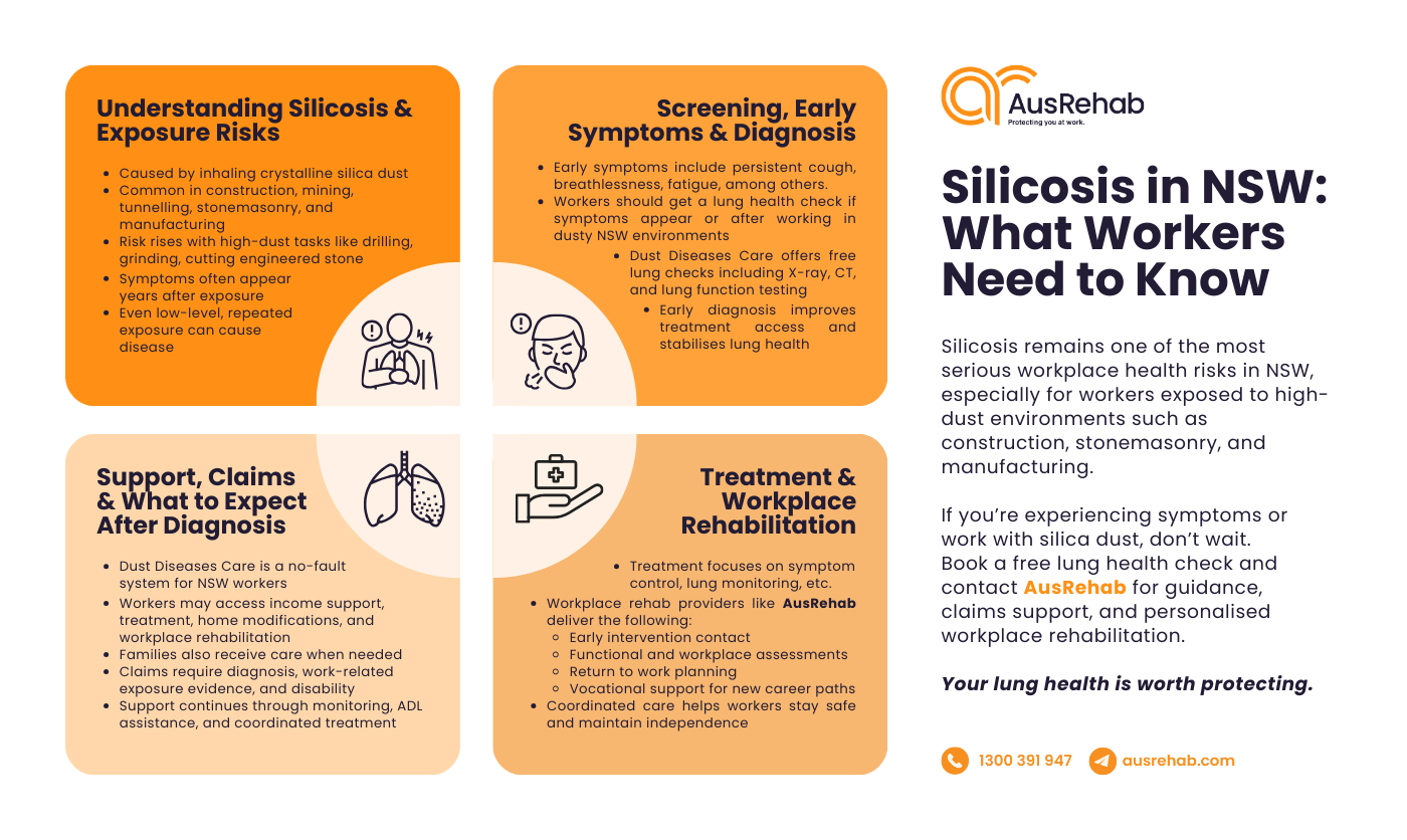 Support is available through Dust Diseases Care and the workers’ compensation system in NSW. Help is also available for families who are unsure where to start. If you receive a diagnosis, workplace rehabilitation through providers like AusRehab can support safe recovery and clear return-to-work planning.