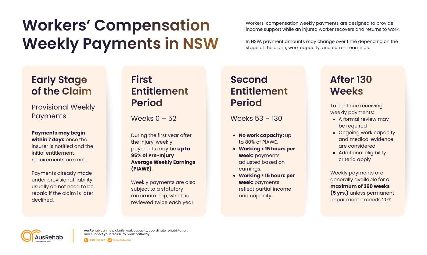In NSW, provisional weekly payments will usually begin within 7 days where the insurer has been notified, and entitlement is established. Payment commencement can occur before the insurer reaches a final liability position. Timeframes often depend on the quality of the information available at the beginning of the claim. Payment amounts can also change as the claim moves through different statutory periods.