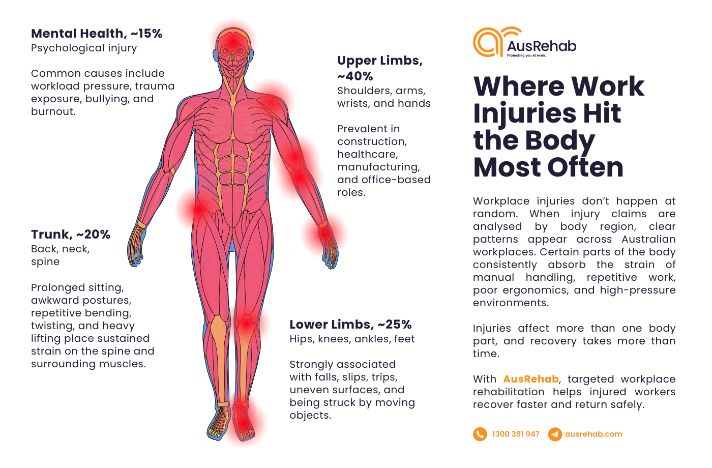 When workplace injury data is grouped by body region, clear patterns emerge. In Australia, upper limb injuries account for the largest share of serious claims. These include shoulders, arms, wrists, and hands, injured during lifting, repetitive tasks, tool use, or manual handling. They’re common across construction, healthcare, manufacturing, and office-based roles with poor ergonomics.