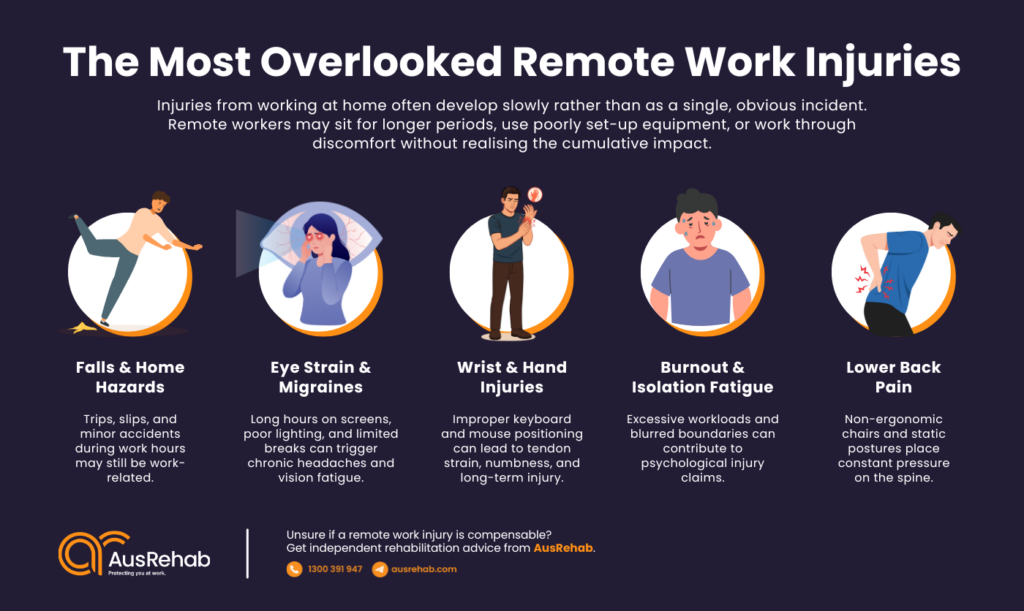 Remote work is now a standard way of working across Australia. More employees are spending long hours at home workstations. Injury patterns are changing as a result. Remote work injuries now feature heavily in workers’ compensation data. Most claims involve posture, repetitive movement, or mental strain.