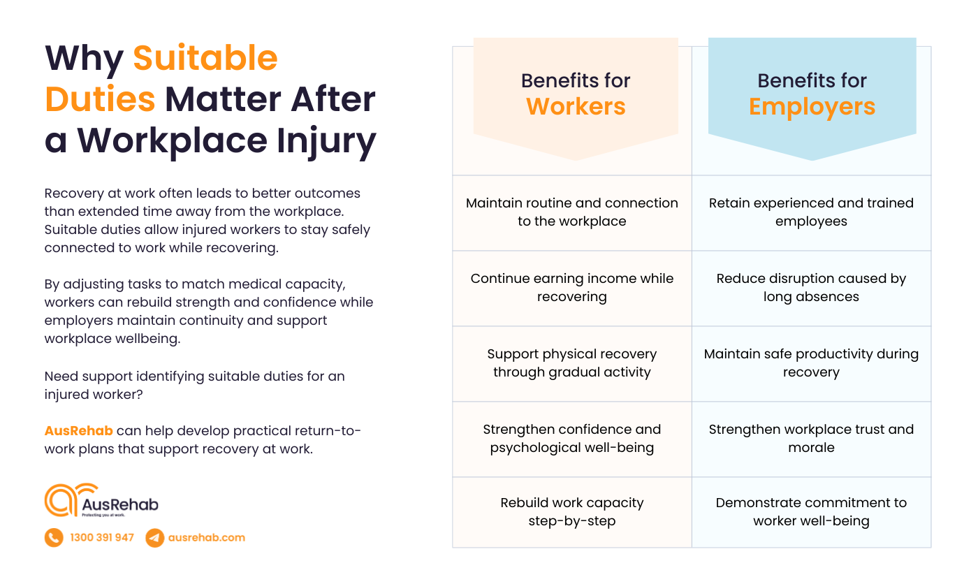 Suitable duties also show a clear commitment to worker well-being. A supportive return-to-work process strengthens trust between workers and employers.